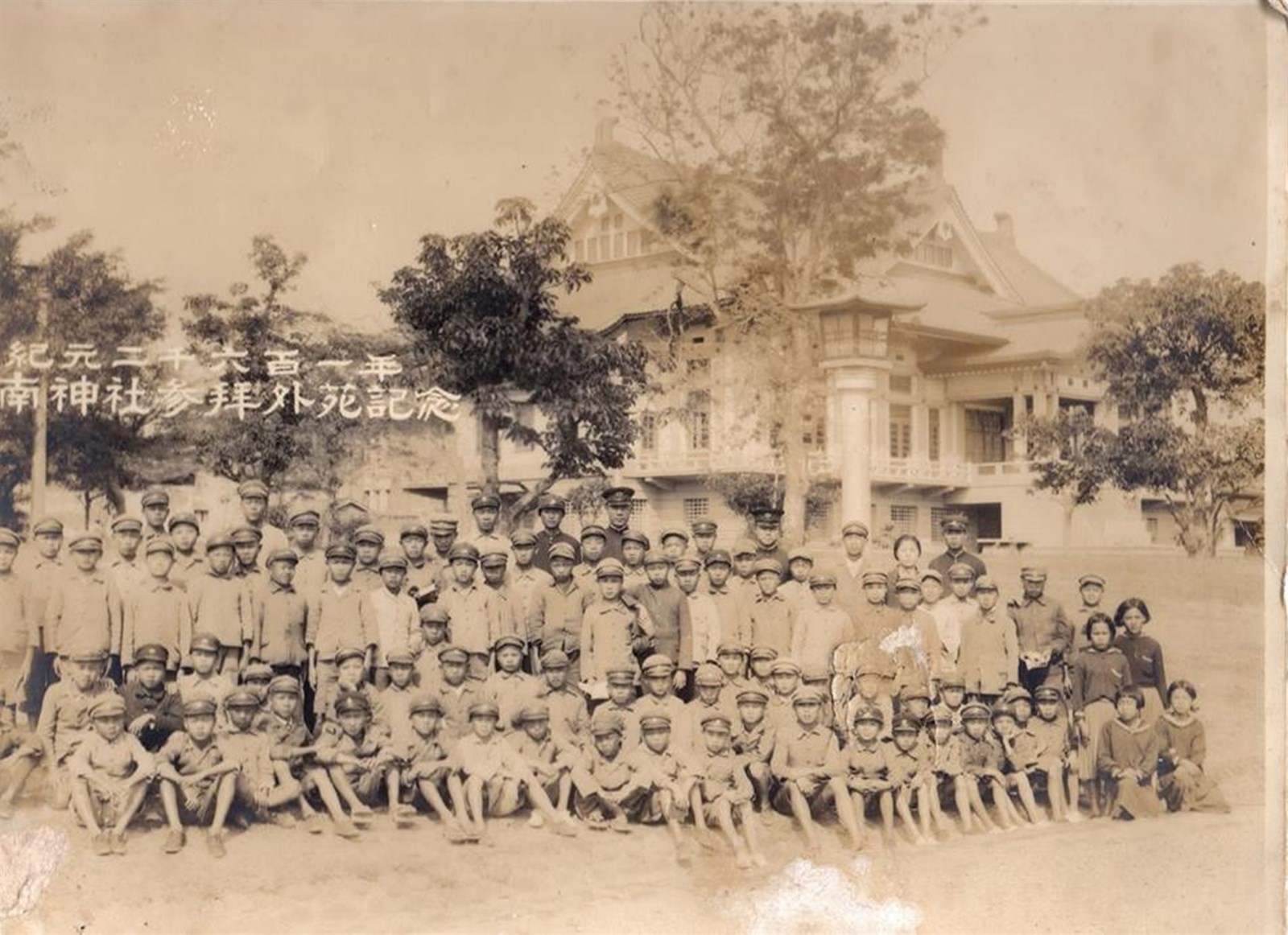 本張照片是昭和16年(1941)口湖國民學校師生進行修學旅行,於台南神社外苑所拍攝的照片,背景即是台南武德殿(現為忠義國小禮堂),所謂的紀元或皇紀,是日本的紀年方式之一,紀元元年是從日本神話裡的第一代天皇-神武天皇即位的年份開始起算,到了昭和15年(1940)剛好是紀元2600年,依此類推,紀元2601年換算昭和16年(1941)的意思。