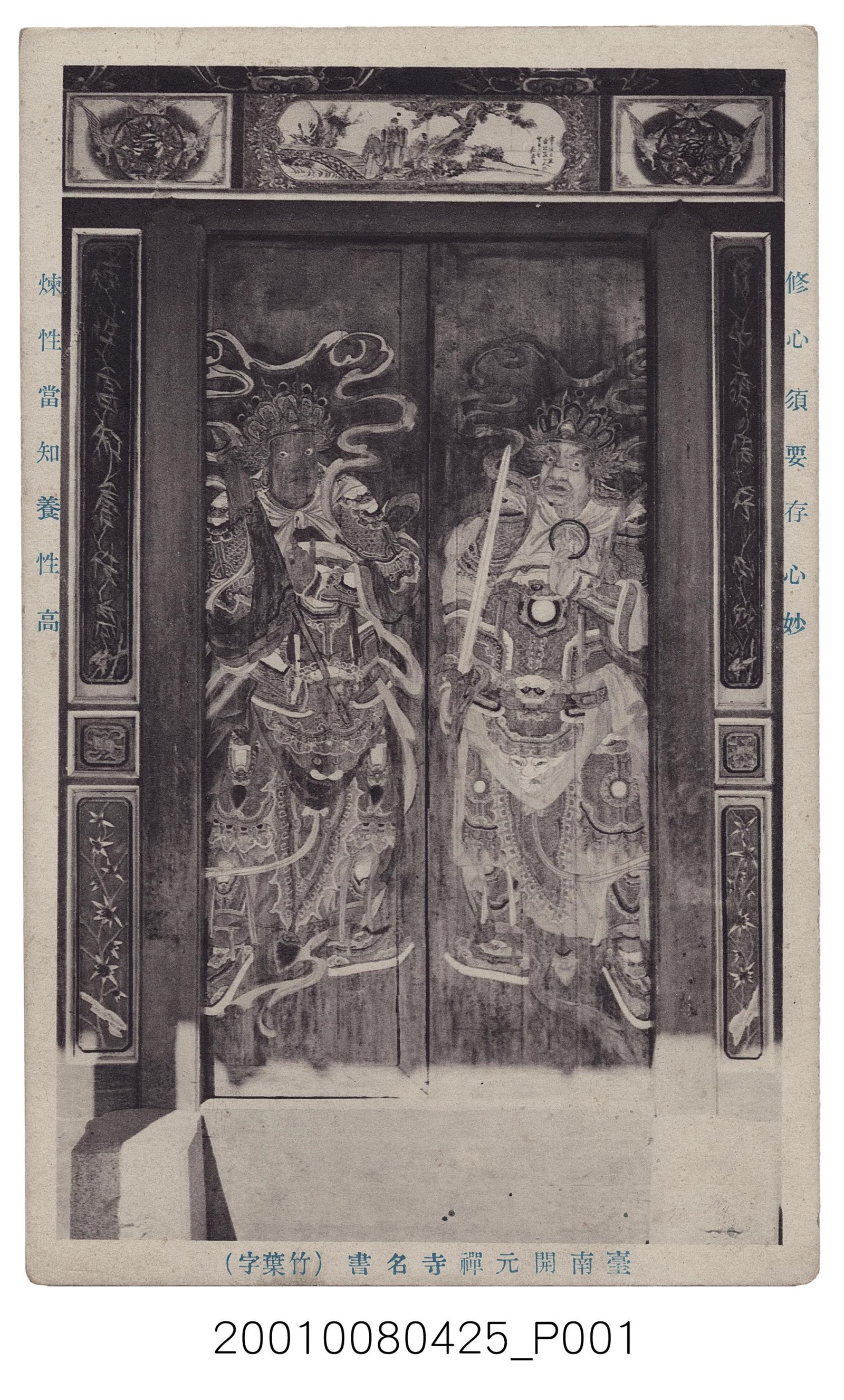 1.此明信片以臺南開元寺門神為主題之明信片,黑白樣式。正面為開元禪寺之門神木板,右為多聞天王,左為廣目天王。兩旁柳條字為「修心須要存心妙,煉性當之養性高」,下方以漢文書寫「臺南開元禪寺明書(竹葉字)」。背面右上角為郵票黏貼處,右側有以漢字、平假名書寫之「郵便はがき」,上方以英文字母書寫「CARTE POSTALE」。