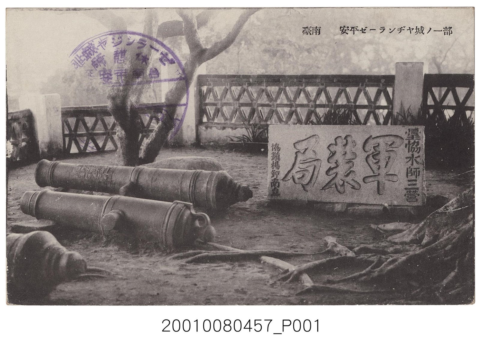 本物件為臺南安平熱蘭遮城之一部分明信片,主題為黑白照片,右方為一上刻「臺協水師三營軍裝局協鎮楊鉀南立」之石匾,左方樹前有一顆石頭與三門炮管(其中一管僅露出炮尾)。明信片正面載有「臺南安平ゼーランヂヤ城趾ノ一部」(臺灣赤崁城址的一部分)字樣,為今臺南市安平區之安平古堡,正面蓋有ゼーランヂヤ城趾休憩所台南市安平紀念章,背面為明信片書寫面,右上方有郵票黏貼處,右側有以漢字、平假名書寫之「郵便はがき」,正上方印有「Union postale universelle Carte postale」,意即萬國郵政聯盟明信片。