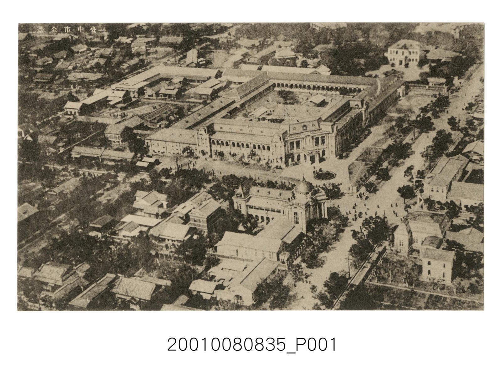 1.本物件是以臺中州廳及其周邊地區為主的明信片,其位置在今日臺中市西區民權路、市府路交叉口一帶。畫面正中篇上方的大建築群為臺中州廳,州廳左側為大屯郡役所,其下方圓形屋頂為市役所、右上方角落處建築物為知事官邸,畫面中最大條的街道即是今日的民權路。正面載有臺中市全景,背面為明信片書寫面,右上角有一郵票黏貼處,並蓋有一紀念章,右側以漢字、平假名書寫之「郵便はがき」,框內有文字Place Postage Here 臺北折井寫真館製,正上方印有「CARTE POSTALE」字樣。