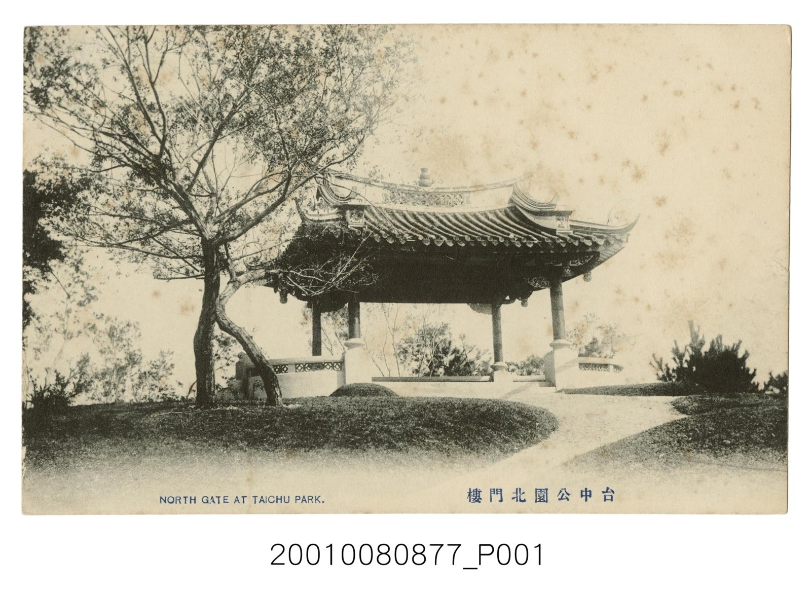 1.本物件為以臺中公園北門樓為主題之明信片,其正面為臺中公園北門樓黑白照片,照片中央為北門樓,旁有一株老樹。照片下方載有「臺中公園北門樓」、「NORTH GATE AT TAICHU PARK.」,背面為明信片書寫面,右上方有郵票黏貼處,右側有以漢字、平假名書寫之「郵便はがき」,正上方印有「CARTE POSTALE.」、「Union Postale Universelle」字樣。