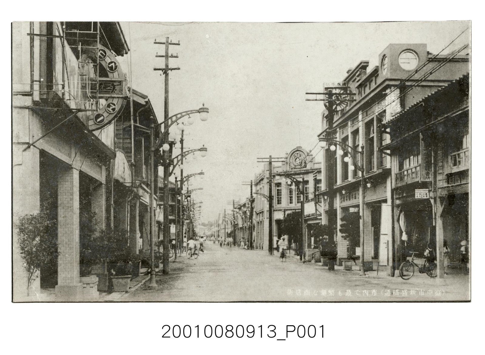 1. 本物件為以臺中新盛橋道路景象為主題之明信片,其正面為新盛橋道路商店街黑白照片,影像中央道路部分有數名騎腳踏車的人,而右側的騎樓下方停有1臺腳踏車,右下方標有「臺中市新盛橋通 市內で最も繁華な商店街」。