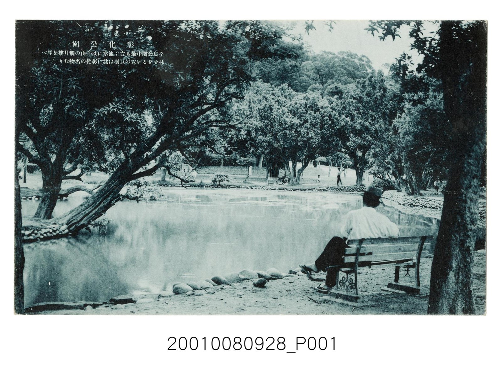 1.本物件為以彰化公園為主題之明信片,其正面為彰化公園黑白照片,影像右側有1個人面對水池方向,坐在樹下的長椅上,對邊的池岸樹下有1輛腳踏車,旁邊有一人坐在草地上,另1人則行走於樹下。影像左上角位置標註「彰化公園」、「全島公園中最も古く池水には卦山の觀月樓を浮べ 林立せる璉霧の巨樹は共に彰化の名物たり」(在全島公園中最古老的池水裡倒映出的八卦山觀月樓,以及高聳林立的蓮霧樹,同為彰化的名產)。背面為空白明信片直式書寫面,以黑色單色印刷,左上角一方框內有一個圓形圖樣標有英文字「CHUKYO」、「C.P.CO.」,其右方有一戳記為「八」的紅色圖章,明信片上方位置標有「郵便はがき」,左方以英文標註「POST CARD」,以及上「Address」、下「Correspondence」,中間有一分隔線。