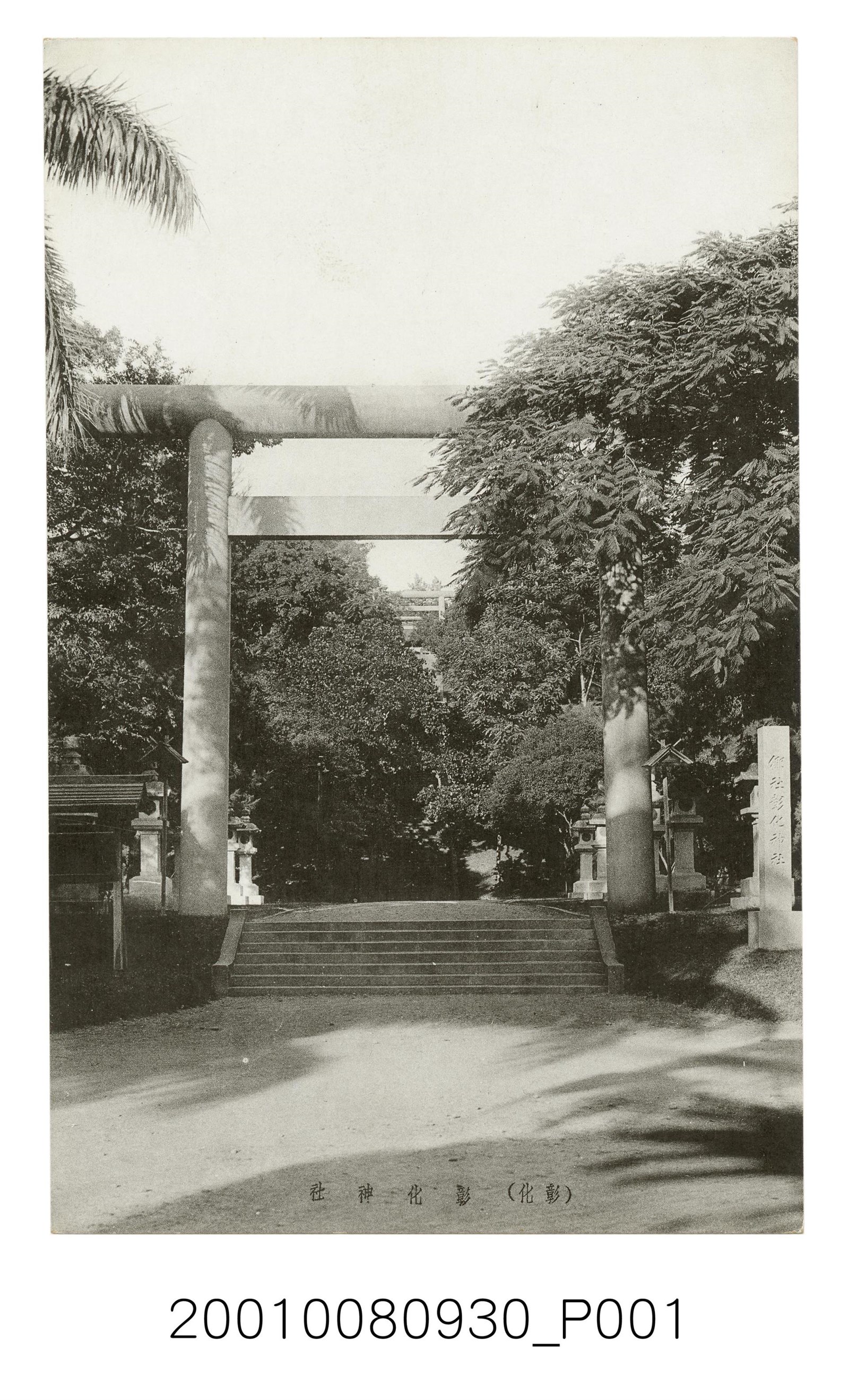 1. 本物件為以彰化神社為主題之明信片,其正面為彰化神社黑白照片,下方標註有「(彰化)彰化神社」,影像石階上方為一座鳥居,後方兩排石燈籠佇立,影像右側有一石柱上刻有「縣社彰化神社」。背面為空白明信片橫式書寫面,以黑色單色印刷,右上角有一方框為郵票黏貼處,右側標有「郵便はがき」,上方有標註「POST CARD」,並在其上方有鉛筆書寫「昭和18」,中間有一飛馬圖樣,兩側分別寫有左「Correspondence」、右「Address」,中間位置有一道分隔線。