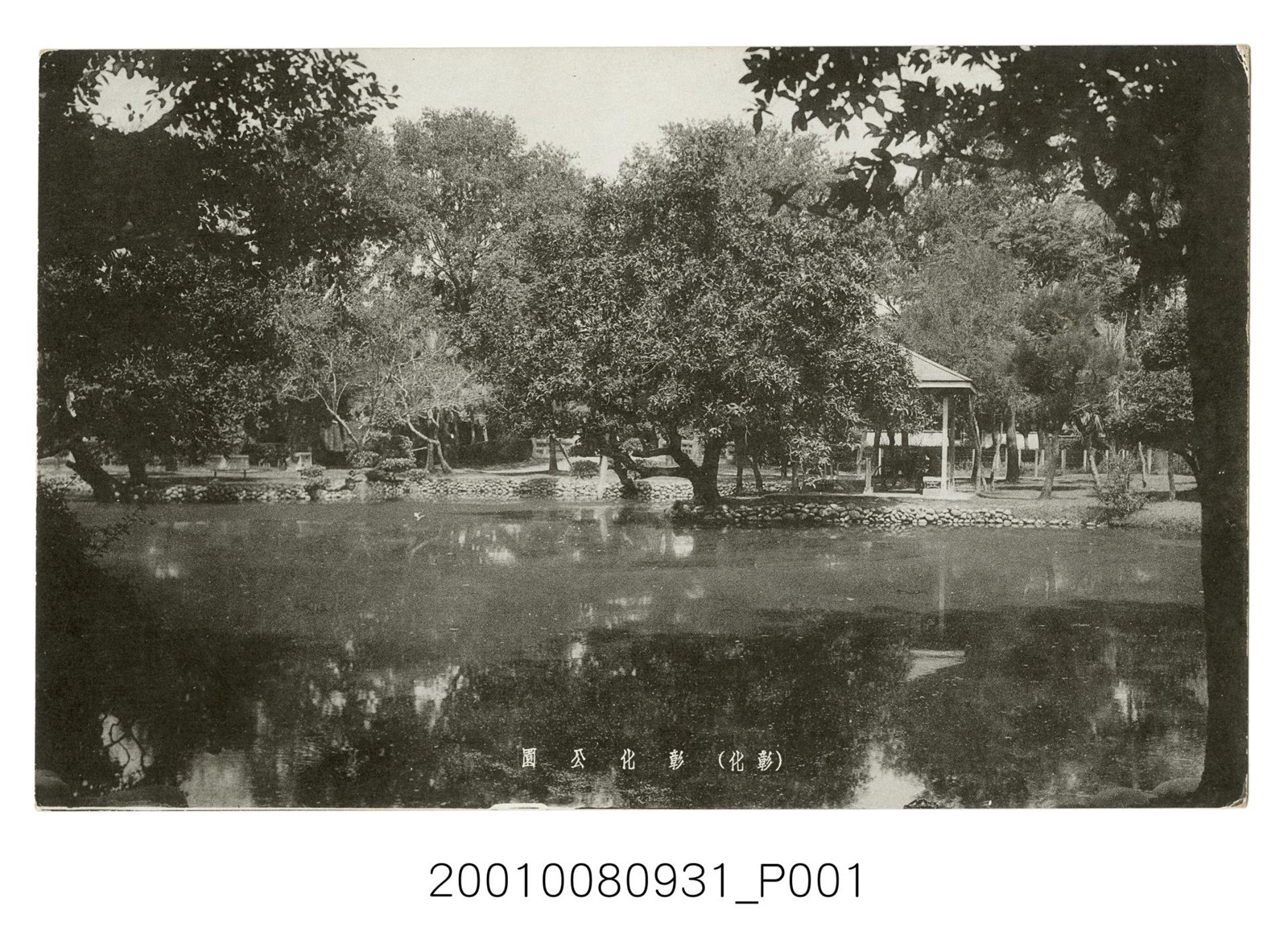 1.本物件為以彰化公園景象為主題之明信片,其正面為彰化公園黑白照片,影像右側池畔有座涼亭,左側池畔的樹蔭下有座長椅,下方標註「(彰化)彰化公園」。背面為空白明信片橫式書寫面,以黑色單色印刷,右上角有一方框為郵票黏貼處,右側標有「郵便はがき」,上方有標註「POST CARD」,並在其上方有鉛筆書寫「昭和18」,中間有一飛馬圖樣,兩側分別寫有左「Correspondence」、右「Address」,中間位置有一道分隔線。