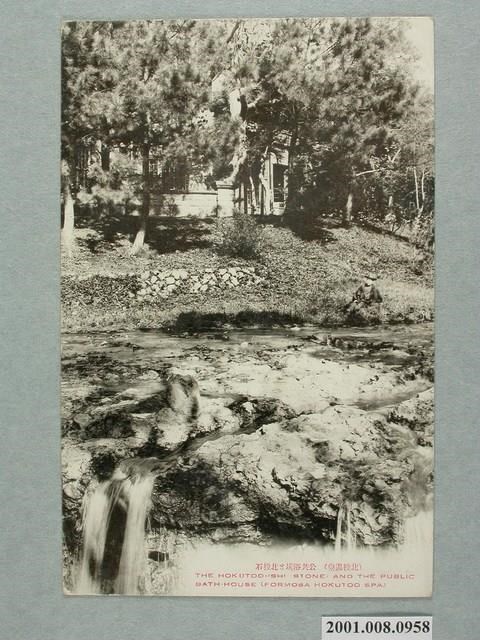 1. 本物件為以北投溫泉為主題之明信片,其正面為北投溫泉公共浴場及北投石黑白影像,影像為拍攝北投溫泉公共浴場泉流周邊的石頭,右側溪流岸邊,有位身著和服的男性戴著帽子坐在草地上,影像右下方位置有兩段文字,由上至下為「(北投溫泉)公共浴場と北投石」、「THE HOKUTOO-SHI STONE, AND THE PUBLIC BATH-HOUSE (FORMOSA HOKUTOO SPA)」。背面為空白明信片橫式書寫面,以深藍色單色印刷,右上角虛線方框為郵票黏貼處,右側標有「郵便はがき」,明信片上方偏右位置標有標有「Post Card」,中間有一分隔線。
