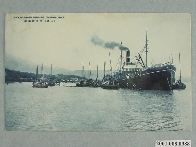 1.雙色印刷明信片,影像內容為淡水港的戎客船將貨物運送接駁至大貨輪的情景,此時淡水河河道日漸淤積,大船已難以入港。