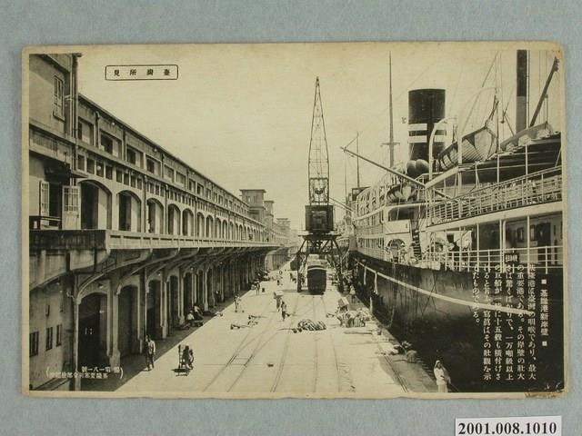 1. 本物件為以基隆新碼頭為主題之明信片,其正面為基隆港碼頭黑白照片,左上角的黑色方框中標有「臺灣所見」,右下角標有兩段文字「基隆港新岸壁」、「基隆港は臺灣の咽喉であり、最大の重要港である。その岸壁の壯大きは驚くばかりで、一万噸級以上の巨船か一時に十五艘も橫付けされろど言ふ。寫真はその壯觀を示じたものでのろ。」(大意為:基隆港是臺灣的咽喉,為最大的港口。其碼頭規模之大可收納15艘1萬噸以上的船停泊。)左下角標有「撮第一八一號 基隆要塞司令部檢閱濟」。背面為空白明信片直立式書寫面,以黃褐色單色印刷,左上角一方框,內寫有「MANUFACTURE BY TAISHO」,方框右側有「郵便はがき」,明信片左方位置標有「CARTE POSTALE」,以及一隻張開雙翼,腳抓持「TAISHO」的鳥,並標有「TRACDE MARK」,分隔線上下兩旁英文字,上為「this space for address」、下為「this space for message」。