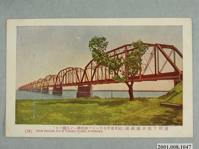 3.上有說明文字:「臺灣下淡水溪橋梁(延長五千七呎ニシテ本邦第一ノ長橋ナリ)IRON BRIDGE OVER TANSUI RIVER, FORMOSA。」(中譯:長達日尺5007尺(約1526公尺),為我國第一長橋。),背面則印刷有「CARTE POSTALE、郵便はかき、臺北新高堂發行」等字,以及日本東京設計、印刷的「千鳥印」印戳,登錄商標為「KANDA TOKYO」(東京神田)。