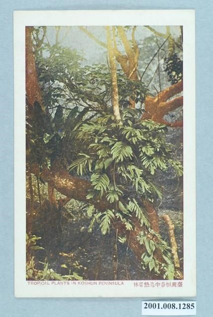 本物件為以臺灣恆春熱帶林為主題之明信片,其正面為恆春樹林植物彩色照片,影像為恆春半島熱帶樹林的一部分,左側位置1一棵山蘇長在樹幹上,下方標註「臺灣恆春半島熱帶林」、「TROPICAL PLANTS IN KOSHUN PENINSULA」。背面為空白明信片直式書寫面,以藍色單色印刷,左上方方框中,由上至下分別寫有「TOKYO」、「DESIGN PRINTING」、「TRADE MARK」、「登錄商標」、「KANDATOKYO」,中央有1寫有「千鳥印」3字的鳥形圖案;方框右側有「郵便はがき」,明信片左側標有「CARTE POSTALE」,中央分隔線上側寫有「臺北新高堂發行」。