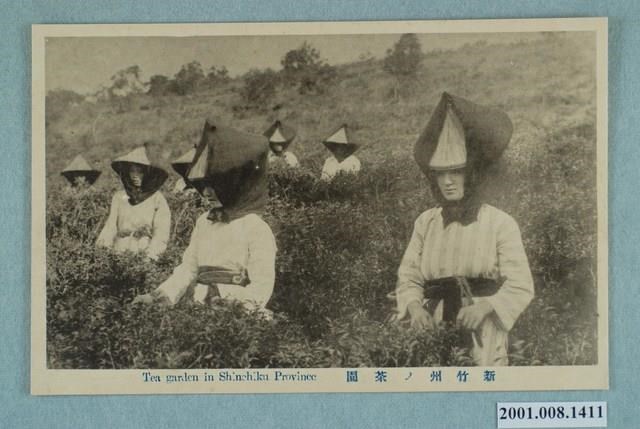 本物件為以新竹州茶園為主題之明信片,其正面為茶園黑白照片,影像中有7名頭戴斗笠,並以布巾覆蓋斗笠,穿著長袖布衣,繫有腰帶的婦女進行採茶作業,影像下方標註:「新竹州ノ茶園」、「Tea garden in Shinchiku Province」。背面為空白明信片橫式書寫面,以暗紅色單色印刷,右上角虛線方框為郵票黏貼處,右側標有「郵便はがき」,左側中間位置標註字樣被截斷無法辨識,上方標有「CARTE POSTALE」,中間以兩條紅線為分隔線。