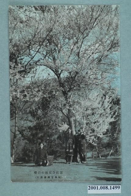 1. 本件是以霧社的櫻花為主題之明信片,其正面為3名賽德克族婦女於櫻花樹前的合照。照片中1名女子蹲坐於地,身旁放置藤籃;2名女子依靠著樹,其中1人吹著口簧琴。明信片正面底端印刷文字「霧社分室前の白櫻」以及「(柯保安商會發行)」。明信片背⾯右上⾓天鵝圖示為郵票黏貼處,中央頂端有個內接「Y」字型的圓形圖案,圖案下方有道分隔線,其餘空白處印刷文字「郵便はがき POST CARD」。
