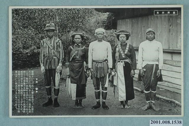本件是以臺灣原住民為主題之明信片,其正面為5名排灣族原住民並排照。照片中的3男2女身著排灣族傳統服飾,雙手放置身體兩側,雙腿併攏面向鏡頭。照片右上角白色方框內寫有「臺灣所見」,左下角處印刷文字「生蕃 臺灣といへば直に生番を想出す。生番は人口凡そ十三萬、多くは山地に部落を成して、特有の原始的生活をつなけてある。時として兇暴の本性を露はして所謂霧社事件の如き凶變を捲起すことがあるが、全体としては漸次皇化にうるほひその性質も大いに溫良化するに至ってある。」(中譯:說到臺灣就會聯想到生番。生番的人口約有13萬人,大部分都居住在山中的部落裡,過著特有的原始生活。有時候也會露出凶暴的本性,例如像是霧社事件的發生,但是現在全體漸漸皇化,並且性情也越來越溫和了。)明信片背面為空白書寫面,右上角方框為郵票黏貼處,方框內印刷「Taisho Mato Brand」搭配左下角鳥型商標圖示。中央有道T型分隔線左右各標以文字「This Space may be used for Communication」以及「The Address Only to be Written Here」,其餘空白處印有「郵便はかき CARTE POSTALE」及「Made in Wakayama」等字樣。