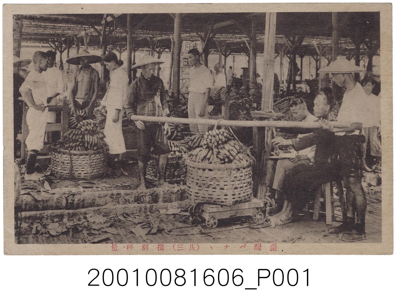 1.本物件為以香蕉市場秤重為主題之明信片,正面有香蕉市場秤重黑白照片,畫面中可見為數可觀的人群聚集於市場中,並且不只一位蕉農正在進行香蕉秤重,後方還有許多一簍一簍的香蕉等著秤量,下方有1段文字「臺灣バナナ(其三)撰別秤量」;背面為空白明信片橫式書寫面,以紅色單色印刷,右上為郵票黏貼處,左側有「郵便はかき」字樣,上方有「CARTE POSTALE」字樣,中央有「臺中州青果同業組合」字樣,其右側有1黑色數字戳印「227095」。