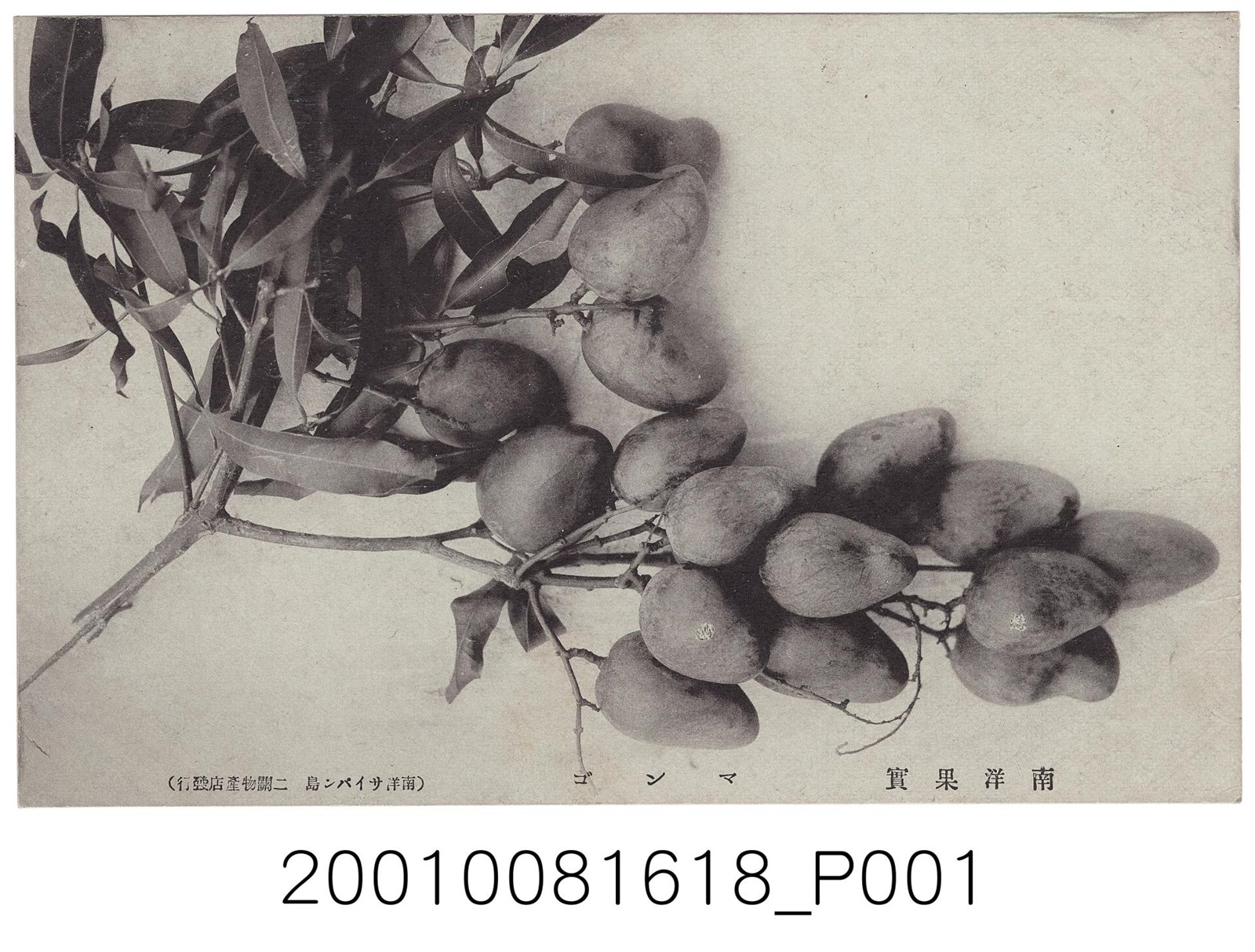 1.本物件為以芒果為主題之明信片,正面有芒果黑白照片,畫面中可見16顆芒果與枝條一同被取下,放置於平臺上,由大小樣式判定應為土芒果,右下有1段文字「南洋果實」,下方有1段文字「マンゴ」,左下有1段文字「(南洋サイパン島二關物產店發行)」;背面為空白明信片橫式書寫面,以黑色單色印刷,右上為郵票黏貼處,有「Place Postage Here」、「SENDAI SAITO. PRINTING CO.」2段字樣,右側有「郵便はかき」字樣,左下有一烏龜圖案與「TRADE MARK」字樣,左上有「Made in Japan」字樣,左側有「CARTE POSTALE」及2行字樣,由左至右為「This Space may be used for Communication」、「The Address Only to be Written Here」。