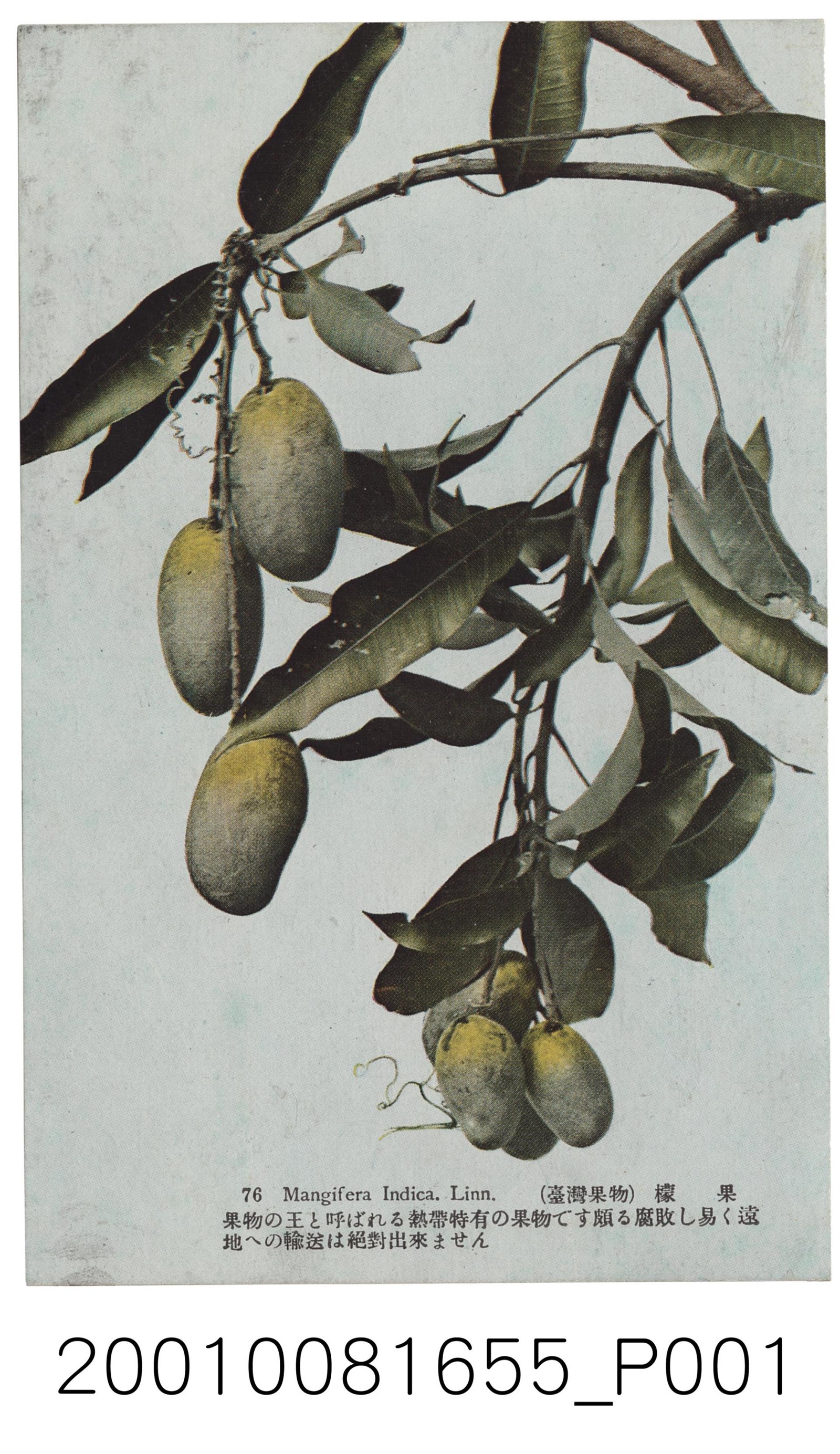 1.本物件為以臺灣果物為主題之明信片,其正面為芒果彩色繪圖,畫面中可見芒果樹樹枝,其前端有三至四顆黃綠色的芒果,明信片正下方有「76 Mangifera Indica. Linn.(臺灣果物)檬果」、「果物の王と呼ばれる熱帶特有の果物です頗る腐敗し易く遠地への輸送は絕對出來ません」,大意:芒果是被稱為水果之王的熱帶特有種,很容易腐敗,很難運輸出口;背面為空白明信片直式書寫面,以灰色單色印刷,左上角有郵票黏貼處,正上方及左側分別有「郵便はがき」、「POST CARD」字樣,正中間則有「臺北生蕃屋本店印行」。