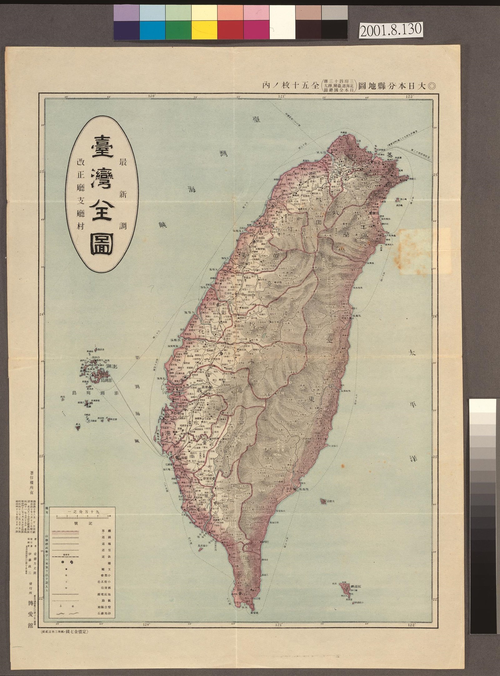 博愛館發行〈最新臺灣全圖〉,是全日本分縣地圖50幅(包含臺灣、樺太等外地)中之一幅,安藤力之助著,1910年4月10日發行第6版,附有地圖封套。