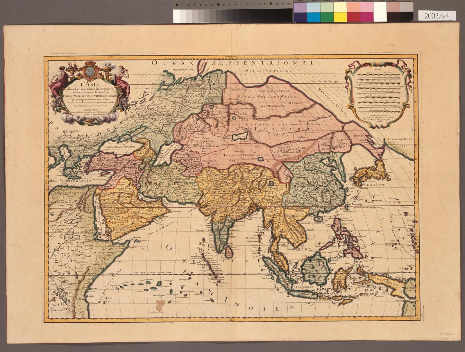 〈亞洲六大地區圖〉(L'Asie divisée en ses Principales Regions, et ou se peut voir l'estendue des Empires, Monarchies, Royaumes, et Estats qui partagent presentement l'Asie.),法文地圖,彩色著色,由法國製圖師Alexis-Hubert Jaillot於1708年出版於法國巴黎。