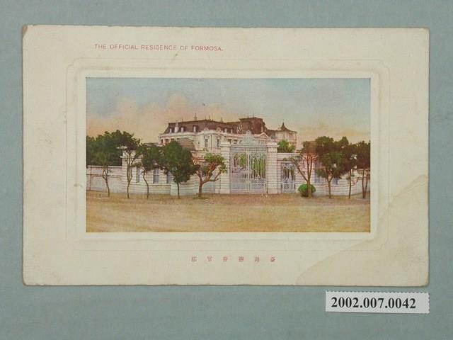1.本物件為以臺北總督官邸為景之明信片。正面為臺北總督官邸大門外之彩色圖畫。明信片左右兩側皆有種植樹木,大門為白色花雕門,門旁的兩個柱子上各有一盞燈。明信片下方載有「臺灣總督官邸」、「B4」、「THE OFFICIAL RESIDENCE OF FORMOSA.」之字樣。該照片地點為今臺北市博愛特區之臺北賓館。背面為明信片書寫面,右上方有郵票黏貼處,黏貼處有一隻鳥的圖案並載有「TOKYO DESIGN PRINTING@KANDA TOKYO登錄商標TRADE MARK」,右側有以漢字、平假名書寫之「郵便はがき」,正上方印有「CARTE POSTALE」,中間印有「臺北新高堂發行」之字樣。