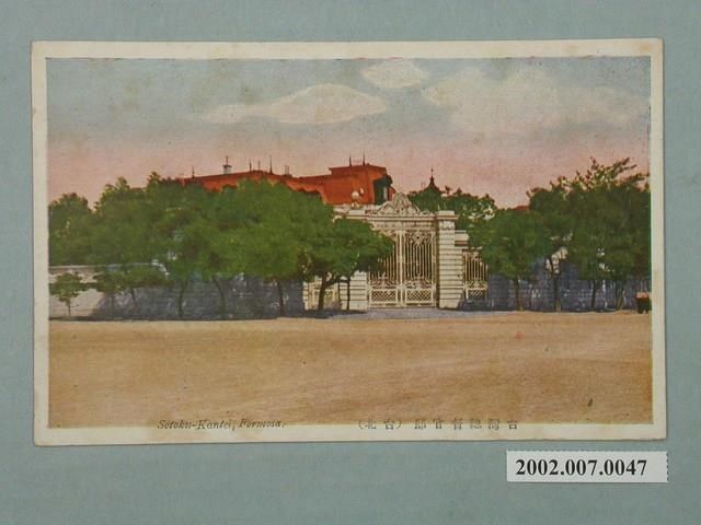 1.本物件為以臺北總督官邸為景之明信片。正面為臺北總督官邸大門外之彩色圖畫。明信片白色圍牆內外皆被樹包圍,白色大門緊閉,門旁的兩個柱子上各有一盞燈。明信片下方載有「台灣總督官邸(台北)」、「Sotoku-Kantei, Formosa.」之字樣。該照片地點為今臺北市博愛特區之臺北賓館。背面為明信片書寫面,右上方有郵票黏貼處,右側有以漢字、片假名書寫之「郵便ハガキ」,正上方印有「CARTE POSTALE POST CARD POSTKARTE CARTOLINA POSTALE OTKPbITOE IIИCbMO」,中央印有「MADE IN JAPAN」,左方印有「杉田商店發行」之字樣。
