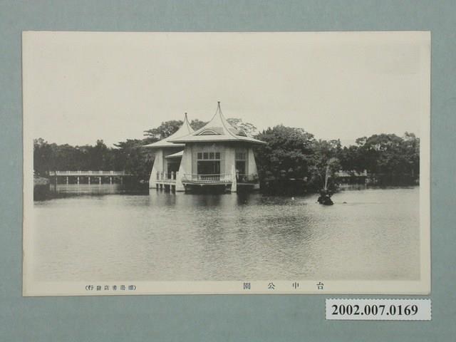 1.本物件為以臺中公園為景之明信片。正面為臺中公園內的池子與亭子之黑白照片。明信片可見中央處有雙亭,其餘地方皆為水池,四周皆被群樹環繞。左側較遠處可看見白色的平面橋,右側湖面則有噴水器在噴水。明信片正面下方載有「台中公園」、「(棚邊書店發行)」之字樣。背面為明信片書寫面,右上方註冊商標。右側有以漢字、平假名書寫之「郵便はがき」,正上方印有「POST CARD」之字樣。
