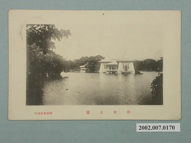 2.臺中公園位於臺中市的東北端,西元1903年始建,面積約28,883坪,園內有四千餘坪的水池,以及各種林泉花木,日治時期建有物產陳列館、臺中神社、後藤新平像、池亭等建築;其中池亭為1908年慶祝縱貫鐵路全線通車所建,來臺主持通車式的日本閑院宮載仁親王曾於此亭休憩。戰後曾更名為中山公園,日治時期建築除池亭及北門城樓外都已拆除。池亭改稱為「湖心亭」,北門城樓改稱為觀月樓。