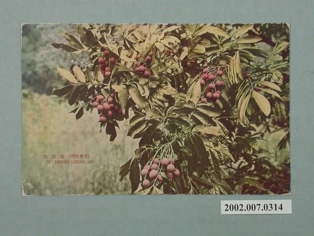 1.本物件為以龍眼為主題之明信片,正面有龍眼彩色圖像,畫面中可見一串串龍眼結於枝枒上。背面右上角為郵票黏貼處,右側有以漢字、平假名書寫之「郵便はがき」,上方以英文字母書寫「CARTE POSTALE」。中間以漢字書寫「生蕃屋商店發行」。