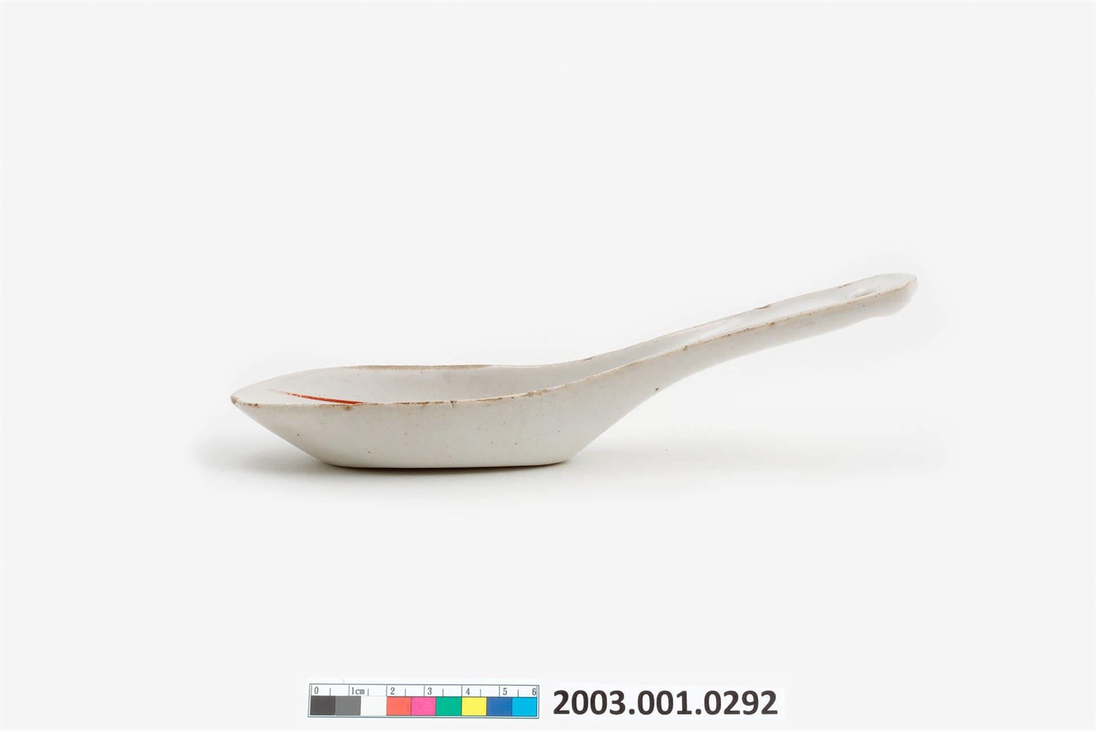 1. 白瓷紅釉蝦紋湯匙,以壓模製成胎體,湯匙內底繪一紅蝦,蝦身輪廓以印模蓋上紅色釉,再以手工繪製蝦眼、蝦鬚與蝦足等細節,匙柄尾端帶一穿孔,背面無紋飾。