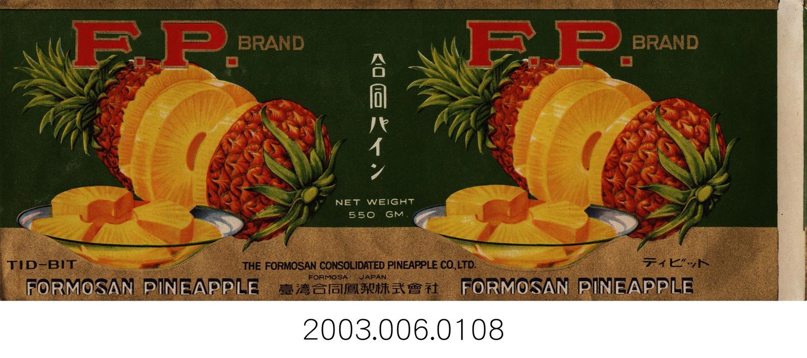 1.本物件為日治時期臺灣合同鳳梨株式會社鳳梨罐頭商標紙。兩側各有一切片之鳳梨圖示,中央有其FOEMOSAN PINEAPPLE之簡寫FP商標,合同パイン即為合同鳳梨之意。下方亦有台灣合同鳳梨株式會社之英文全名,THE FORMOSAN CONSOLIDATED PINEAPPLE CO.LTD。