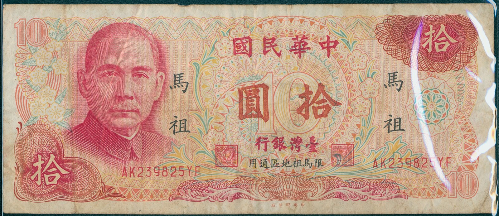 本物件為2017年透過<馬祖民俗文物館展示文物提昇計畫>所收集之系列物品。本物件為馬祖地名新台幣拾圓劵。為了鞏固地方財政,除於在臺發行外,新臺幣之外,同時發行外島地名新台幣,包含大陳、金門與馬祖各區,以管控貨幣的流通。馬祖地名新台幣始於1959年(民國48年)11月1日,馬祖戰地政務委員會與台灣馬祖通匯處聯合公告發行,首推出壹圓、伍圓與拾圓劵三種幣值,並僅限馬祖地區使用。 馬祖地名新台幣伍拾圓劵於1978年(民國67年)6月16日在馬祖地區公開發行,印製年份為1976年,屬橫式新台幣鈔。正反面為紅色兼花式配多色,正面左方為國父像,左右印「馬祖」黑字,下方印「限馬祖通用」黑字,反面中間為總統府,左右印「馬祖」兩字。