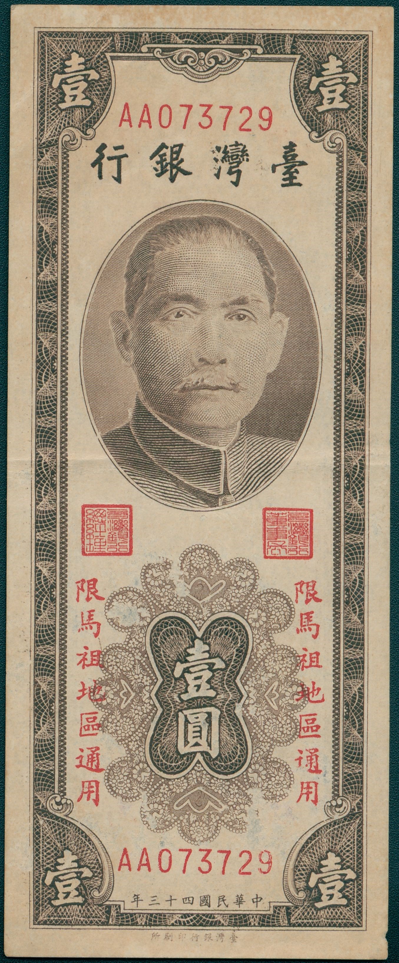 本物件為2017年透過<馬祖民俗文物館展示文物提昇計畫>所收集之系列物品。本物件為馬祖地名新台幣伍圓劵。為了鞏固地方財政,除於在臺發行外,新臺幣之外,同時發行外島地名新台幣,包含大陳、金門與馬祖各區,以管控貨幣的流通。最早地名新台幣卷於1952年1月推行於浙江大陳島,金門於1952年5月開始推行。馬祖推行時間較晚,行政院於1957年11月30日頒布「馬祖新臺幣行使及匯兌管制辦法」,後因823炮戰緣故,延至1959年(民國48年)11月1日,馬祖戰地政務委員會與台灣馬祖通匯處聯合公告正式發行,首推出壹圓、伍圓與拾圓劵三種幣值,並僅限馬祖地區使用。 馬祖地名新台幣壹圓劵於1959年(民國48年)11月1日在馬祖地區公開發行,為首批馬祖地名新台幣,與新台幣伍圓、拾元幣卷共同發行,屬直式新台幣鈔,印製年分為1954年(民國43年),正反面皆為棕色,有臺灣銀行印製所和中央印製廠兩印製版本,本物件屬前者,發行數量為200萬張,後者印製者則發行100萬張。