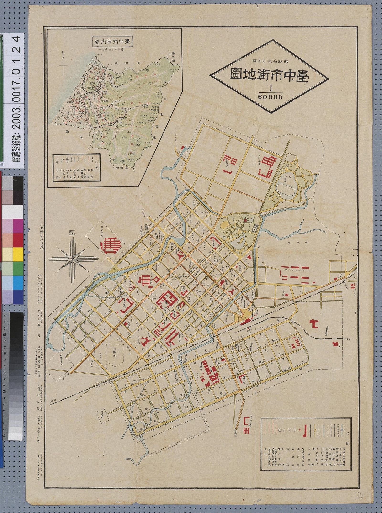 繪製範圍為臺中主要市街,功能分類為市街圖,也具有交通旅遊圖之性質。內容為臺中市區主要街道、町與丁目劃分,道路、鐵道、私設鐵道、計畫道路、計畫水路、手押臺車線、自動車線、官署、派出所等資訊。主要地標建築描繪精細,色彩分明,且有地番資訊,是日本時代臺中市街圖的精品。無地形描繪,無經緯度,地圖方向指北。附有「臺中州管內圖」,比例尺六十萬分一。