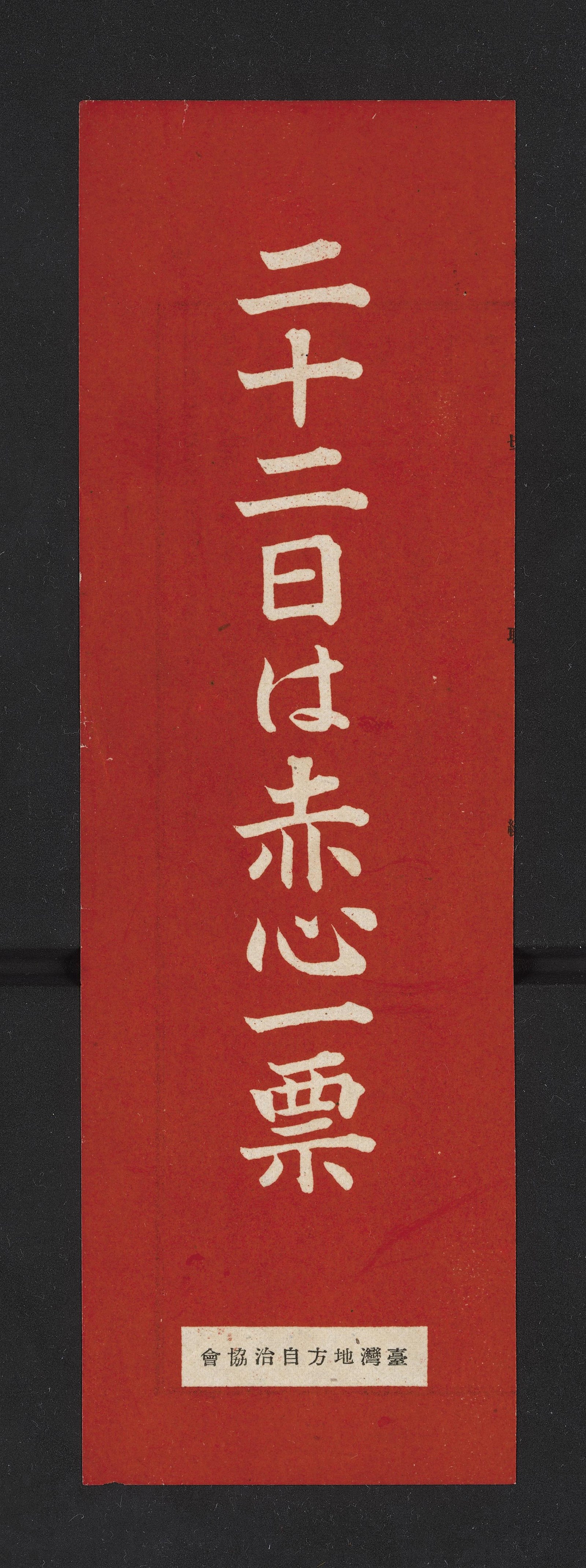 此物件為選舉標語,以深紅為底色,以灰白色文字直書「二十二日は赤心一票」,標語下方有小字註記「臺灣地方自治協會」。