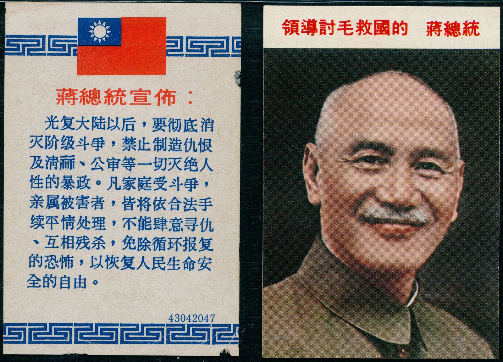 本物件為2017年透過<馬祖民俗文物館展示文物提昇計畫>所收集之系列物品。此物件製作時間點不詳,此物件正面蔣中正頭像,並註明「領導討毛救國的蔣總統」;物件背面為總統宣佈,其內文為「光復大陸以後,要徹底消滅階級鬥爭,禁止製造仇恨及清算、公審等依竊滅絕人性的暴政。凡家庭受鬥爭,親屬被害者,皆將依合法手續平情處理,不能肆意尋仇、互相殘殺,免除循環報復的恐怖,已恢復人民生命安全的自由。」。台海心戰策略始於1959年蔣介石在中國國民黨第八次全國代表大會中強調心戰政戰的積極開展,直到1992年11月7日戰地政務解除後正式停止心戰政戰。