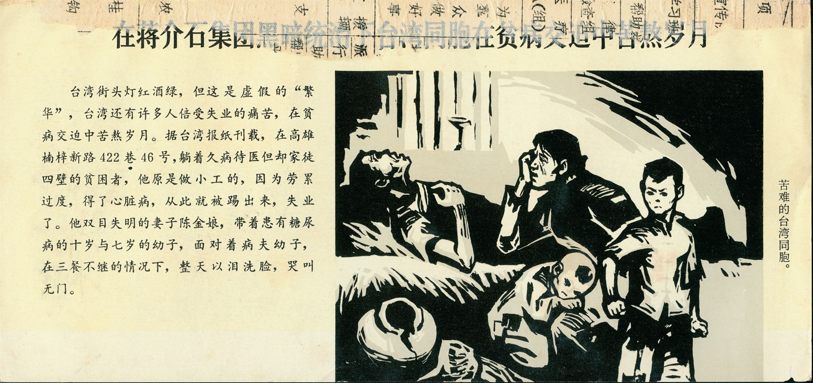 此物件為心戰政戰中方宣傳卡,製作時間不詳,為大陸對台宣傳之宣傳單。其宣傳卡以醫療比較作為主題,宣傳卡正面以福建婦女先天纖維瘤病的醫治案例作為宣傳,宣傳卡背面則以台灣在民主資本社會環境下醫療醫治的困境為宣傳內容。