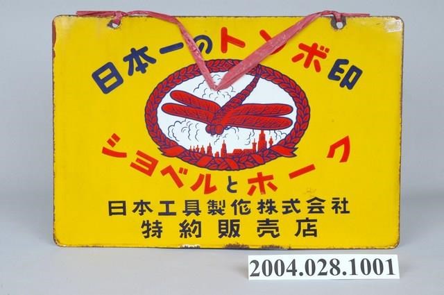 本物件為蜻蜓牌日本工具製造株式會社鐵招牌,材質為鐵質,為長方形鐵招牌,正面為黃底,可見中央處有商標圖案,為紅色繩索圍繞呈橢圓,內有紅色蜻蜓圖案,除圖案外正面則從上而下分別有「日本一のトンボ印」、「ショべルとホーク」紅色及黑色字樣,與「日本工具製作株式会社特約販売店」黑色字樣,正面邊緣有部分鏽蝕,背面為相同圖案與字樣,物件上方有2個孔洞,供繩線穿過,供吊掛使用。