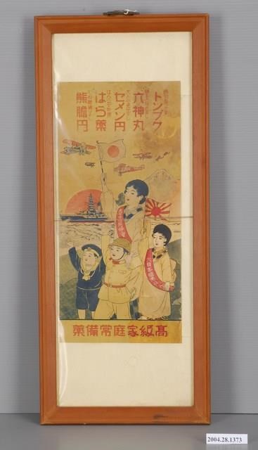 1.本物件為高級家庭常備藥海報。海報為長條型,色系偏黃。海報上的文字分成兩部分,第一部分位於海報上方,由右而左有五種藥名,トンプク、六神丸、セメン円、はら薬和熊膽円,藥名旁有小字,但難以辨識。第二部分位於海報最底部,為「高級家庭常備藥」。海報的中間站有四名人物,一位婦人與三位小孩。婦人身穿和服,外面套有連身黃衣,身上披有一條紅帶子,寫著 「大日本國防婦人會」,右手中高舉日本國旗。三位小孩中較高者為女生,服裝打扮如那位婦人,一樣披有紅帶子,右手中高舉日本太陽旗。次高的小孩為男性,身穿日本陸軍土黃色軍服,頭戴軍盔,高舉右手。最矮的小孩亦為男性,身穿日本海軍深色服裝,高舉右手。人物背後有1艘軍艦在海上、6架飛機在天空和一座山,此山應為富士山。四位人物皆面向同一方向,像在向某個對象揮手和揮旗,應是向出征的家人或將士致意。