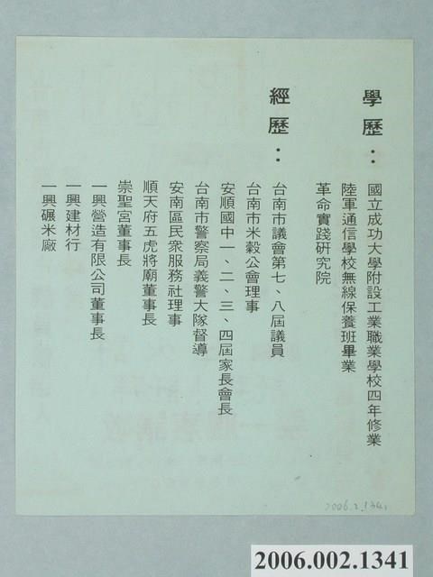 此物件為一紙質選舉文宣,內容為臺南市議員候選人許火旺的相關介紹,正面寫有許火旺的選舉事務所地址及電話,以及附有許火旺的照片跟選舉口號,背面則寫有許火旺的學歷及經歷。