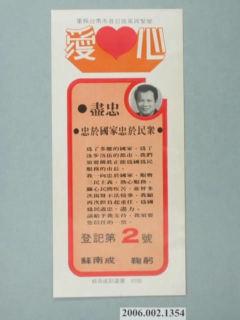 此物件為一紙質的選舉文宣,內容為第8屆臺南市市長候選人蘇南成的介紹,印有蘇南成的照片跟候選人的選舉號碼2號,且寫有相關的競選文宣以及口號「重振台南市昔日雄風與繁榮」,並署名「蘇南成助選團」。