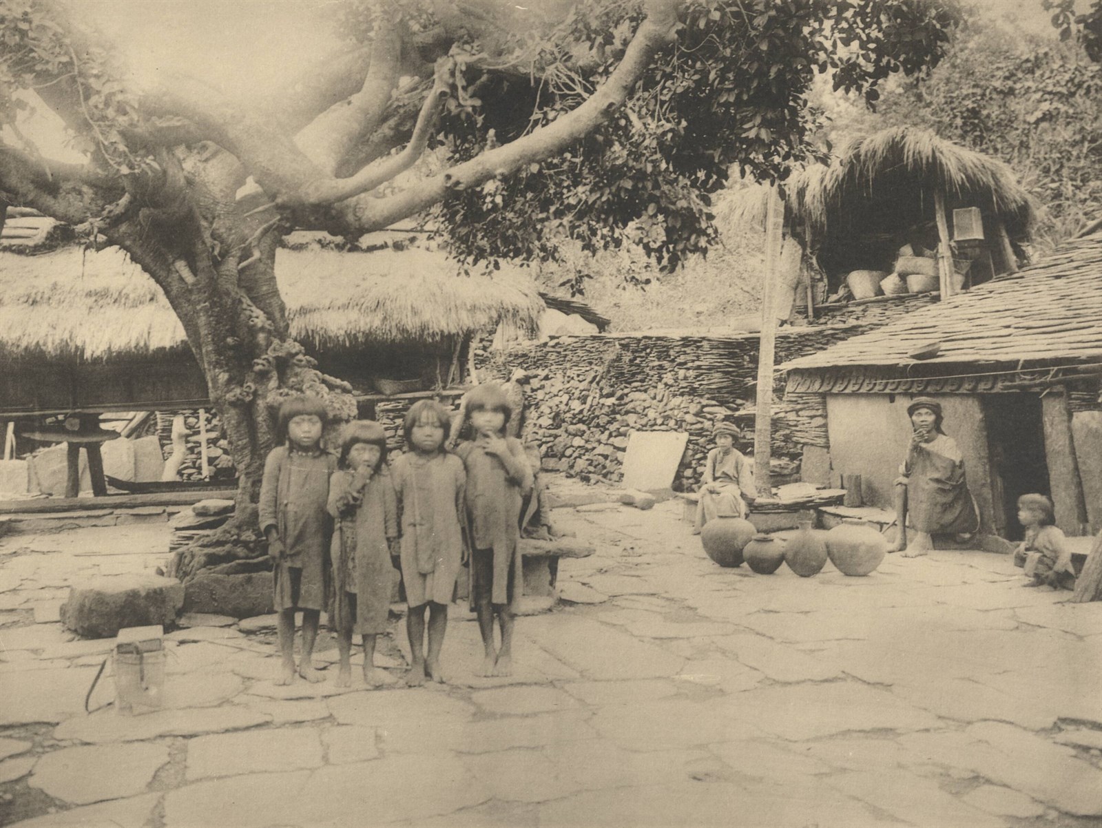 拉瓦爾群囗社頭目住宅。院子中央有一棵榕樹。所有頭目的家屋前,都種有榕樹,表示頭目所在的象徵。頭目主司祭祀,他們相信祭祀時祖靈即降臨,此樹,故榕樹是宗敎儀式上所必須的。住宅的屋頂及牆壁皆用板岩石板,院子地上也鋪石板,屋簷下的橫木上雕有人面者為頭目家系的象徵。放在院子地板上的陶器,是從古代傳下來的家寶。左後方的建築物是穀倉,站在中央的是該社的小孩。