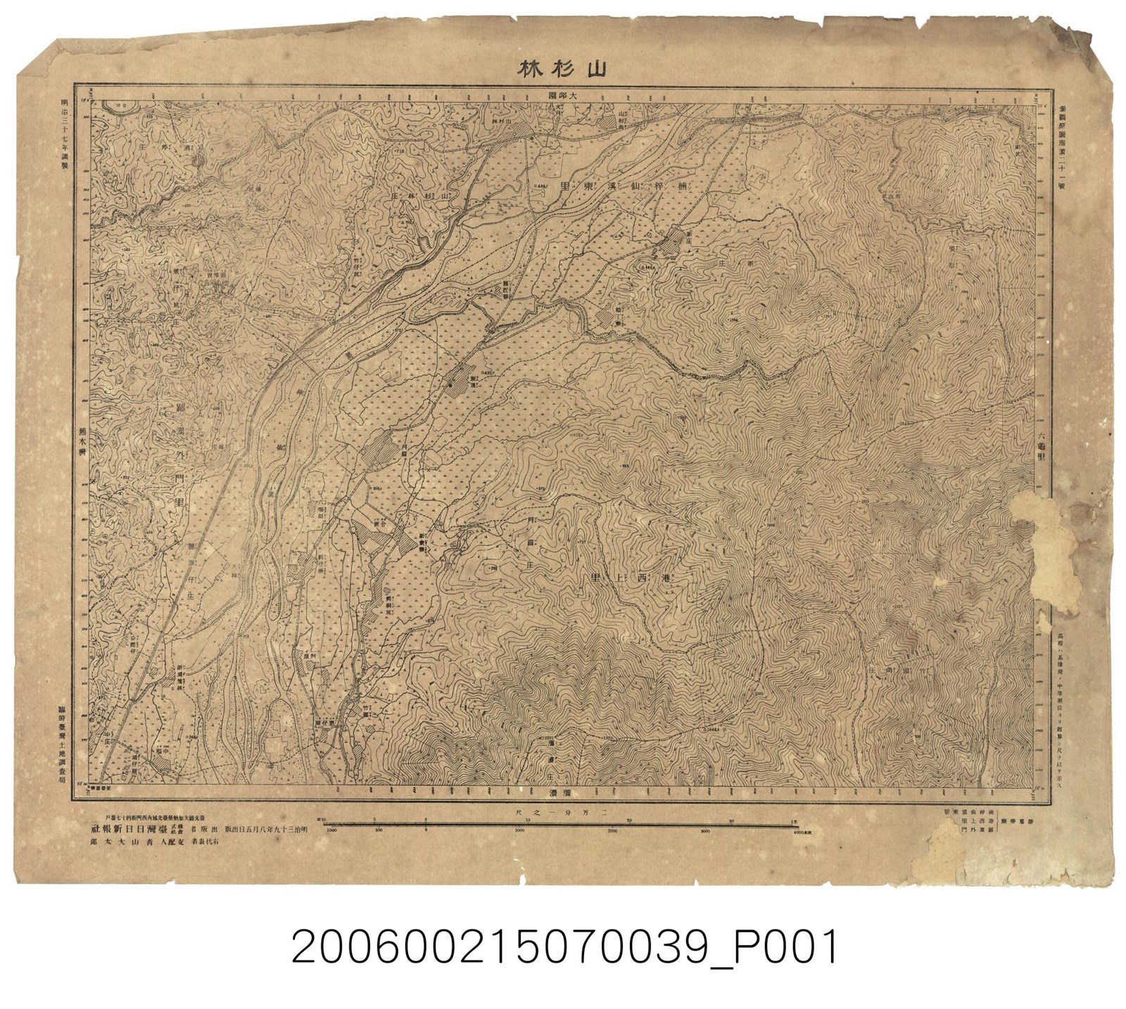 〈山杉林〉,比例尺二萬分之一,為堡圖原圖瀰濃二十一號,臨時臺灣土地調查局調製,臺灣日日新報社出版發行,1904年調製,1906年8月5日出版。