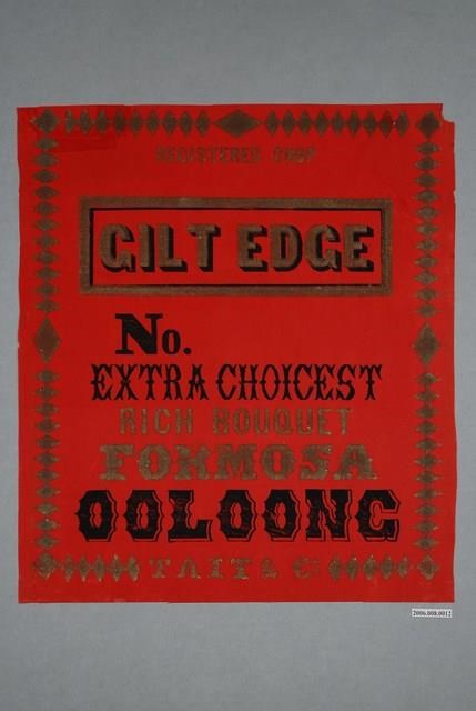 1.本物件為英商德記洋行金邊牌烏龍茶商標紙,紙張下方「TAIT & CO」字樣即為英商德記洋行縮寫。上方寫有「REGISTERED CHOP」字樣,意即註冊商標,「GILT EDGE」為其品牌名,中間「EXTRA CHOICEST」意即特選、精選之意,「RICH BOUQUET」意即豐富的香氣,「FORMOSA OOLOONG」即為福爾摩沙烏龍茶。商標紙本體以紅色為底,四周有許多菱形圖案圍起作為裝飾。