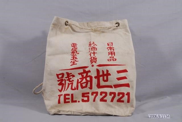 1.本物件為三世商號帆布袋,袋子為米白色,袋上正反兩面以紅色印有三世商號所販售的物品及電話,袋上共有四個孔洞並穿過一條白色繩子作為提把。