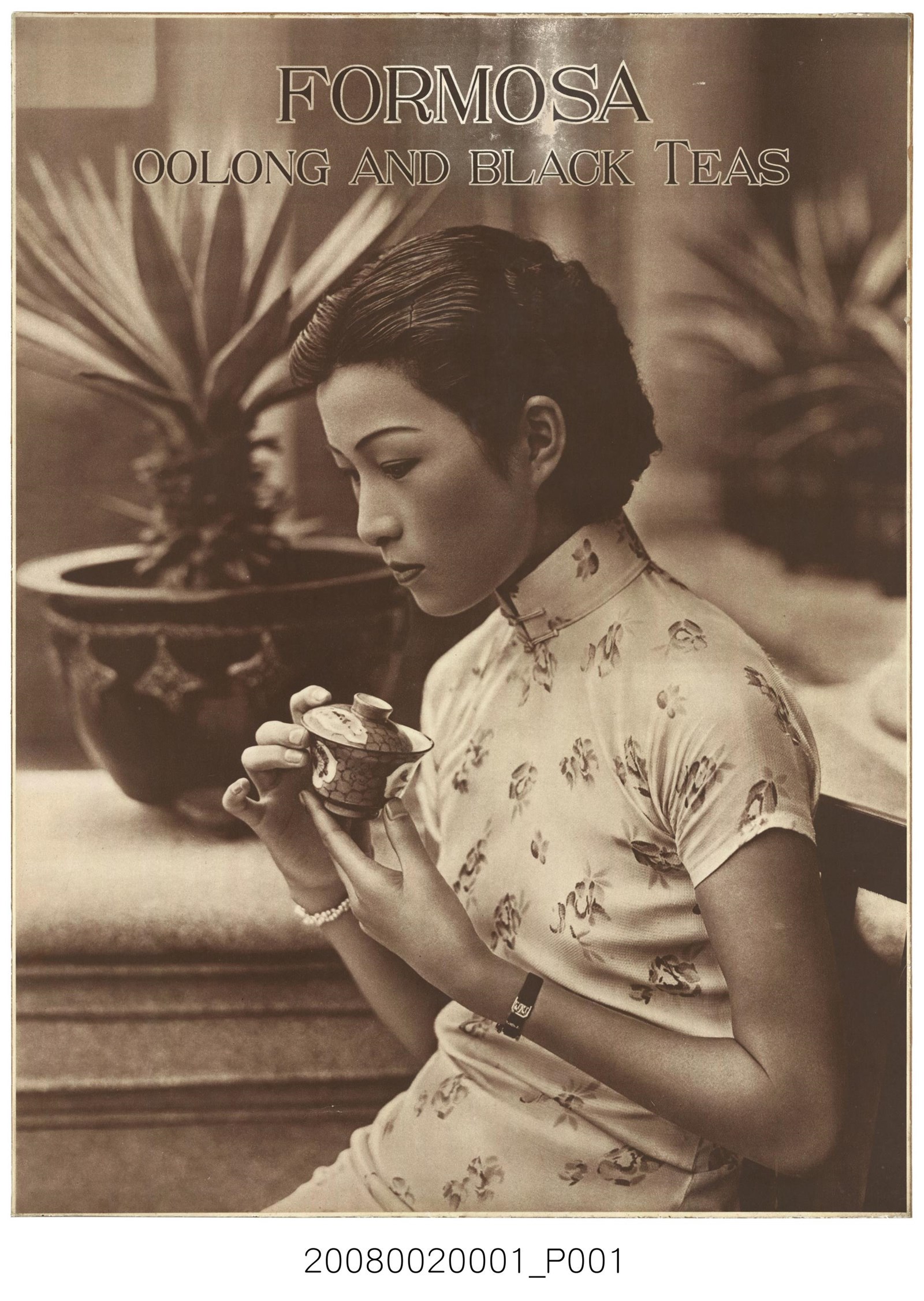 本物件為臺灣烏龍茶和臺灣紅茶海報,海報中有一身穿旗袍、戴手錶和腕飾,手持蓋茶的女子,背景有幾株盆栽,海報上方寫著「FORMOSA OOLONG AND BLANK TEAS」,即為臺灣烏龍茶與紅茶,海報貼於一木板上,保存完整。30年代是臺灣茶的顛峰時期,從製造、輸出、到行銷已經成為相當嚴密的組織結構。而茶商公會在多次海內外博覽會或展覽會裡都有主動出擊的參展策略。實際上,用「喫茶店」美女招待,舉行試飲活動,同時也用女性圖像的海報,作為對外推廣宣傳的手法。