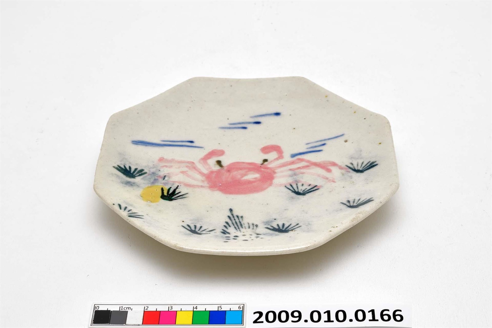 此件為侈口,八角形小盤,圈足露胎。釉面有多處氣孔與縮釉痕跡。盤中央寫意幾筆胭脂紅釉繪成的螃蟹,並以寥寥數條藍線代表水波,深綠色釉料描繪出水草暗示了螃蟹爬行的地面,整體構圖稚趣野拙。傳統吉祥圖案常以螃蟹表示「科甲題名」之意,取螃蟹的「殼甲」之諧音而成。此類紋飾繪製的器皿,多用在節慶宴客之時。