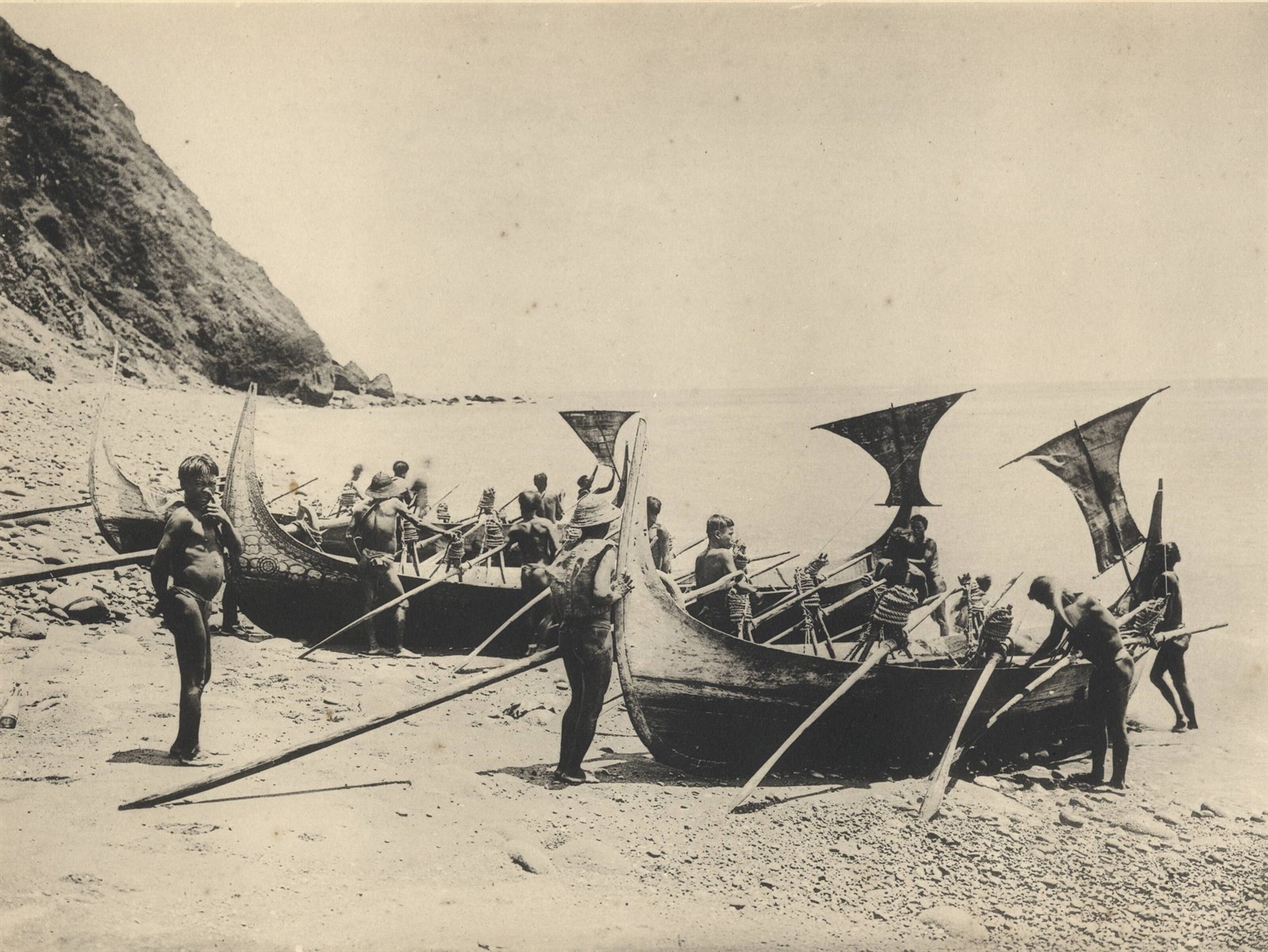 蘭嶼雅美族的船,將要下海時的情況。此船並非由一整塊木頭彫成的獨木舟,而是具有龍骨,並由數塊木板拼成的。船上彫刻的圖案每社相異,具有一望即知是屬於何社者的特徵。船的一端揷有一枝以某種茅草編織而成的帆。