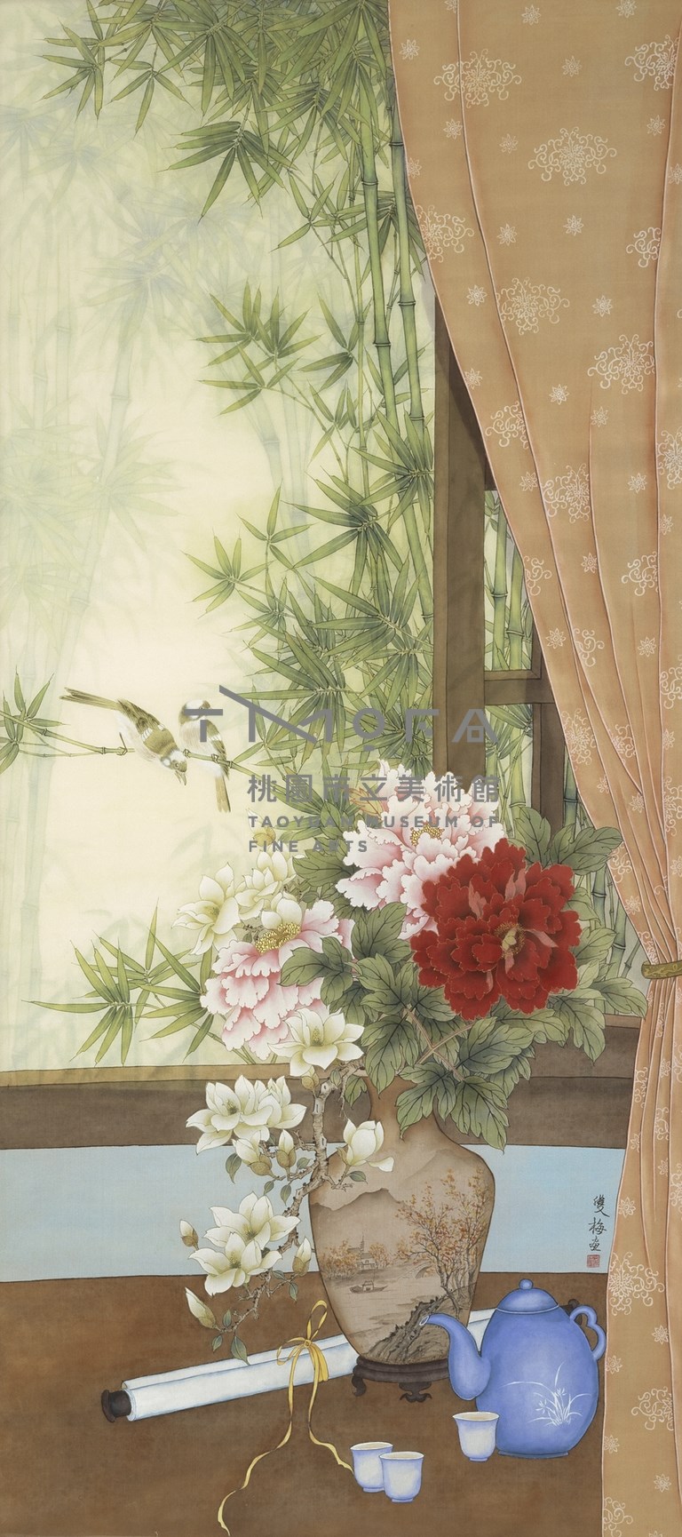 此作畫幅窄長,作者將上方三分之二都留給了開放的窗口,叢竹分布在右側,左側留空處敷以半透明的淡黃色,表現春日的柔和光線。桌上瓶花、茶壺與畫軸約略組成三角形構圖,畫軸與三只茶杯的擺向則暗示著空間深度。畫中景物多集中在右側,與左側形成佈局上的虛、實對比。此畫以工筆細描再施以重彩,牡丹的紅與粉紅、粉藍色的茶壺、以及翠綠的叢竹形成畫面的主旋律,雖是對比強烈的色彩組合,作者卻以柔化的手法降低彩度,使全畫氣質溫和典雅,細膩展現春天溫煦陽光下的輕柔質感。