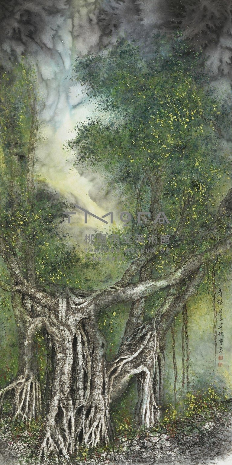 彭玉琴(1949-)所作〈尋根〉描繪老榕樹盤根錯節,枝葉蔥鬱,天空雲霧迷幻。作者款識:「尋根。歲在丙子仲秋,彭玉琴。」姓名章:「彭」(白文)、「玉琴」(朱文)。