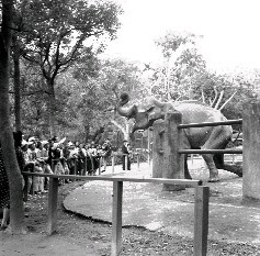 圓山動物園設立於日治時期大正3年(1914年),迄今已百餘年歷史。最初為民營,大正4年被臺灣總督府收購,成為官營動物園,大正5年起正式營運。戰後初期,圓山動物園剛從戰火中走出,動物種類及數量減少,但戰火並未嚴重損及動物欄舍,因此戰後的建物大多沿襲過去的規模。1940年代後期開始以動物表演、動物展覽會等活動吸引遊客。1950年代開始擴建並大量引進新動物,新增獸欄園區,面積約5.8公頃。民國75年,因圓山原址無法擴建,遷建至木柵地區,此即國人現在所熟知的「木柵動物園」。圖為民國37年11月所拍攝,大批遊客在圓山動物園內觀賞母象「瑪小姐」的表演。事實上大象區內只有一隻母象「瑪小姐」,為大正15年(1926年)購入,是圓山動物園的第一頭大象。照片中的瑪小姐,當時已30歲了。