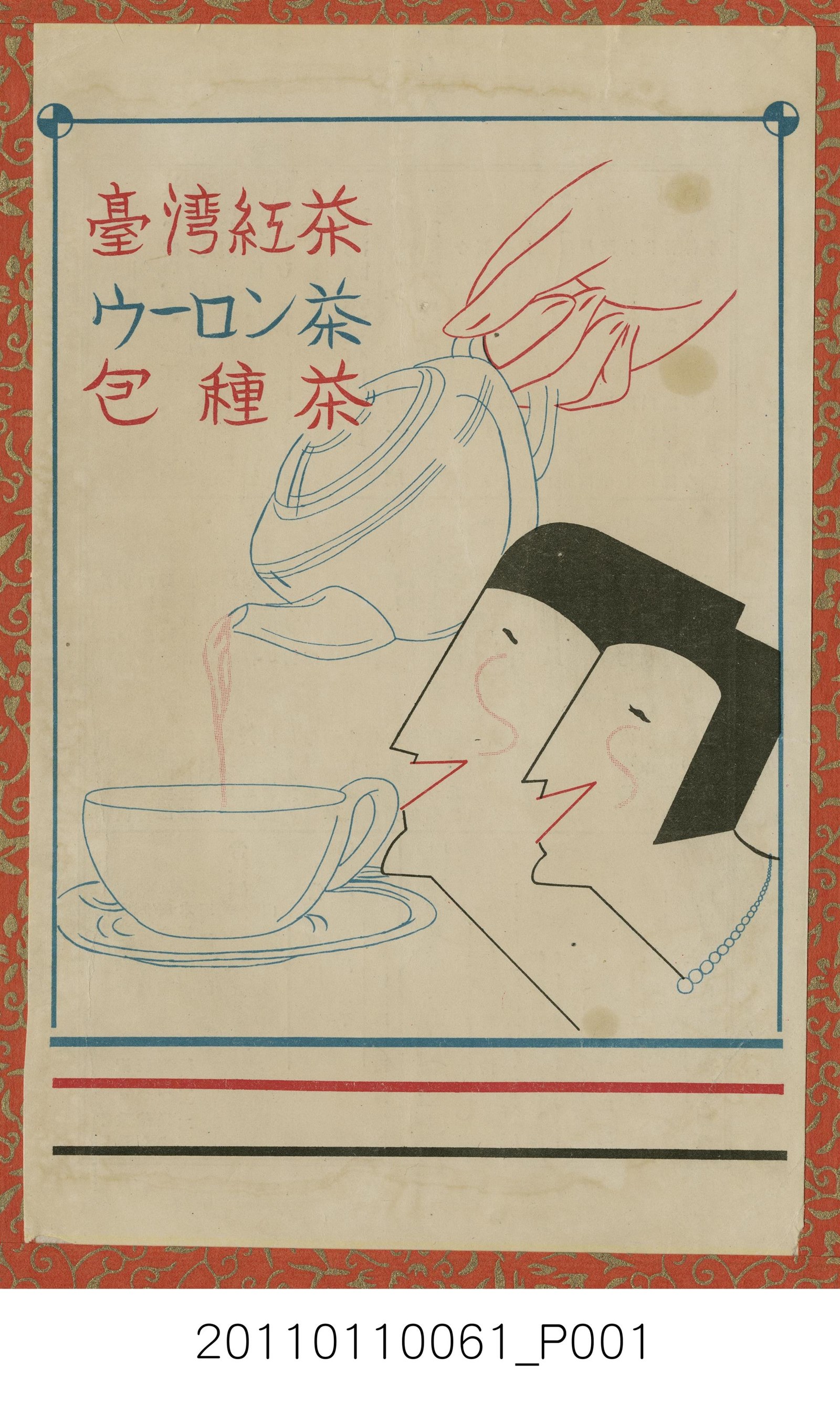 本物件為臺灣紅茶烏龍茶包種茶廣告。廣告黏貼在一張紅色花紋的紙上,廣告畫面中間是右手拿茶壺將茶湯倒在茶杯裡,畫面右側為兩人露出聞香表情。畫面左上方寫有「臺灣紅茶ウ-ロン包種茶」等字樣。